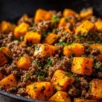A hearty one-pan meal combining ground beef and sweet potatoes, perfect for busy weeknights.
